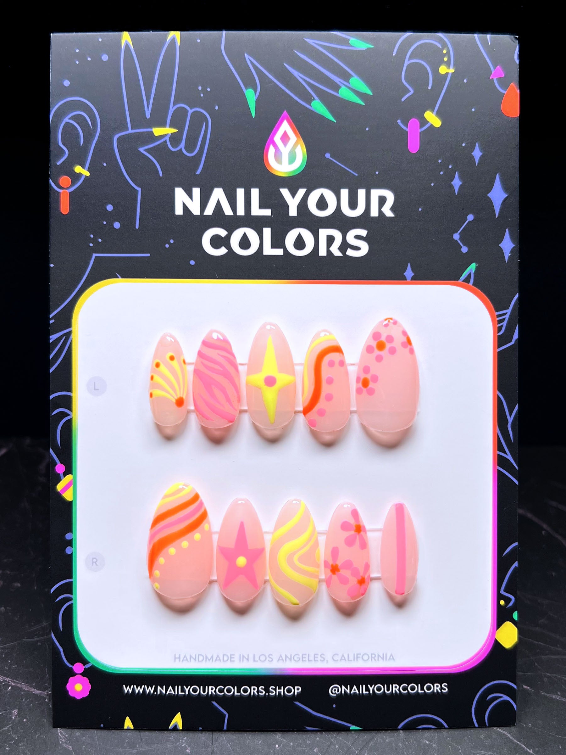 Please allow 5–10 business days for your nails to be painted and prepped before shipping. Each set is designed and hand painted by me, Lee Ann, in Los Angeles, using 100% salon quality gel polish. With proper application and care, these reusable press-ons last 2-3 weeks.